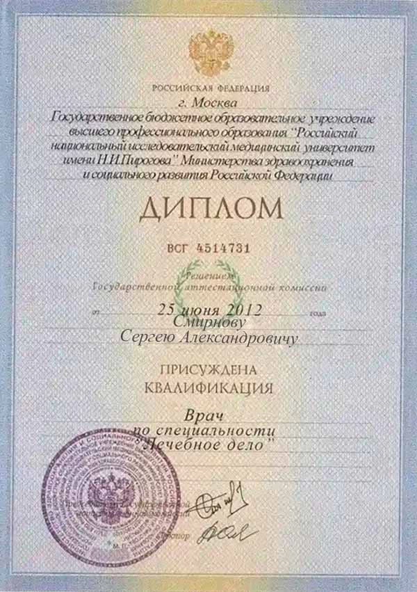 • 2012 г. — ГБОУ ВПО «РНИМУ имени Н.И. Пирогова» Минздрава России (лечебное дело);
